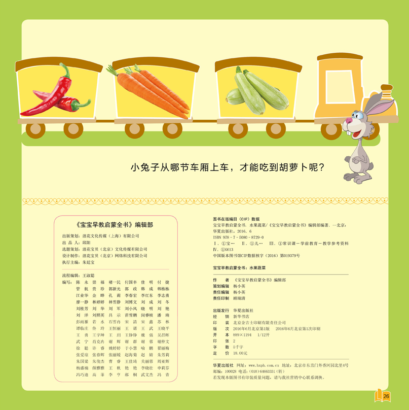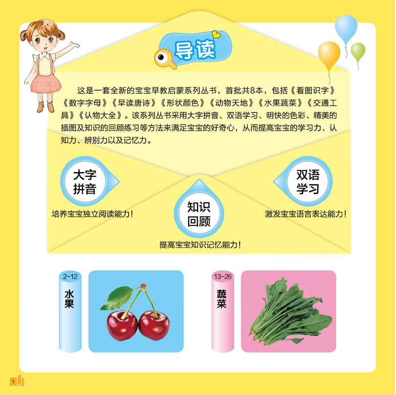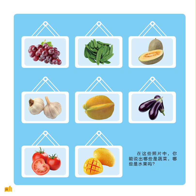 本书为套书中的《水果蔬菜》,集合了上百种常见的水果和蔬菜,内容丰富,画面生动,同时采用大字拼音、双语标注等方法来激发宝宝的好奇心,扩大宝宝的知识面,增强宝宝的辨别力、记忆力和独立阅读能力。