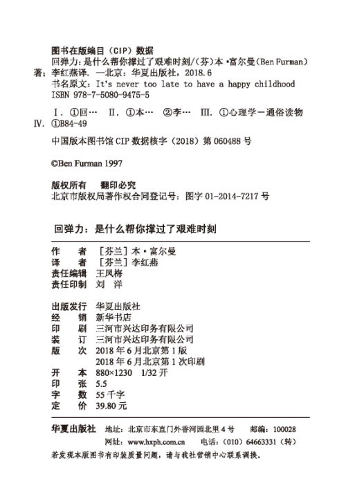 《回弹力》这本书绝对是一本薄书,估计这是本·富尔曼医生体谅到了现代读者的忙碌。本书展现的深邃的后现代心理学思想、积极心理学理念和深切的人文关怀,深深地打动了我。我真切地意识到,只有一直关注儿童心身发展、重视儿童快乐健康、真正乐于帮助很多逆境儿童克服困难,在心理学、社会学、人生哲学领域功底深厚的大师,才能以如此简洁、高效、精准的优美文字,诠释如此深奥、精致、细腻的人生哲理,并将它们以通俗易懂的方式呈现给普通大众。当然,李红燕女士信达雅的翻译也功不可没,为本书增色不少。诚如富尔曼医生所言:“苦难是成长过程的一部分,即使我们对孩子循循善诱,尽力保护他们免受苦难,他们当中的很多人也还是会在成长过程中经历或多或少的创伤。”任何成功的历史人物,都有一段不平凡的童年。即使在和平年代,人们也难免会经历一些意想不到的生活磨炼,中国的王阳明倡导“事上磨心”,古诗词也赞赏“梅花香自苦寒来”。20 多年的临床心理学经验也让我深切感受到,惟有走过逆境、克服困难、经过挫折的快乐,才可能是真正意义上的快乐。然而,并不是所有的人都有能力战胜苦难,或有运气走出苦难的阴霾,很多儿童饱受苦难的折磨,伤痕累累,乃至被苦难吞噬,无法回到正常生活。我们需要很多的方法和手段,才可能帮助孩子们免受苦难的摧残。
